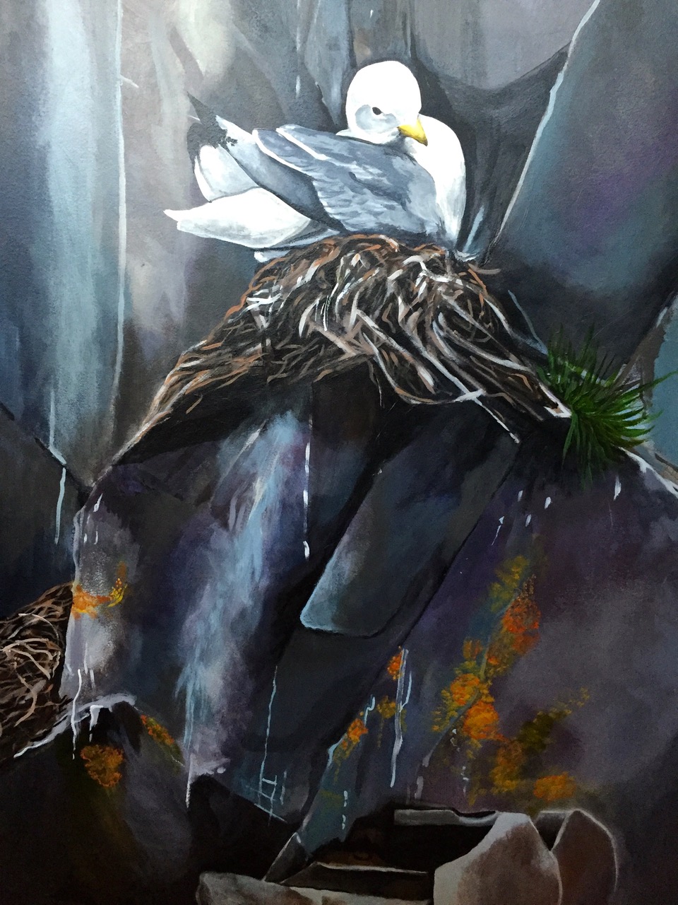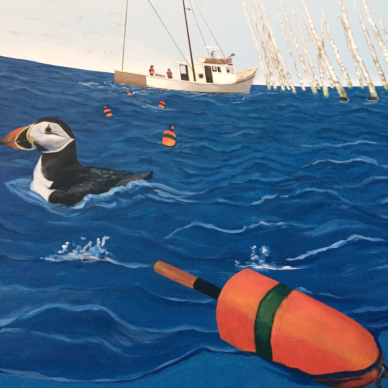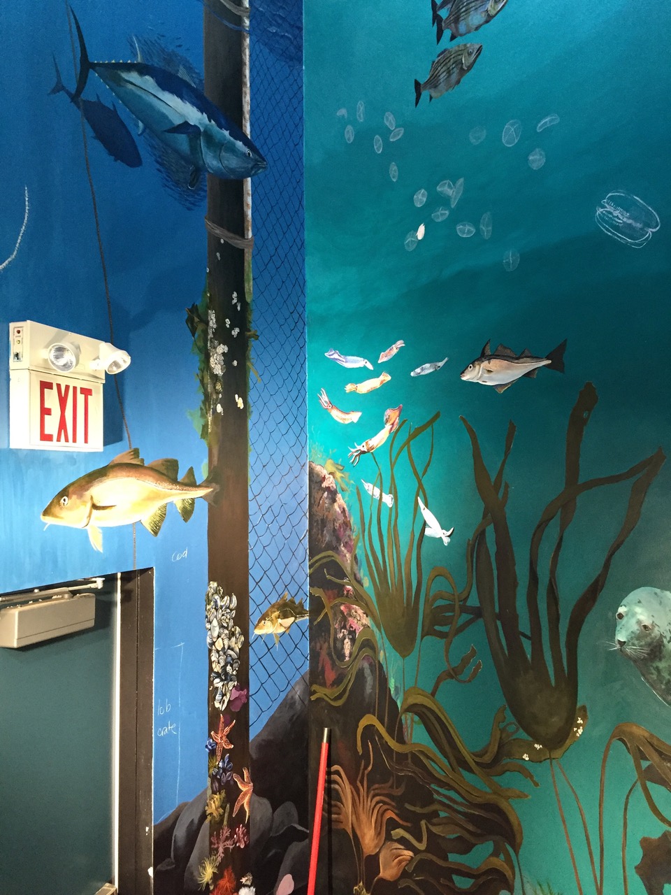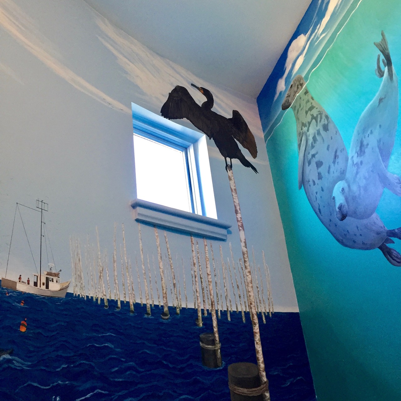 In 2015 and 2016, I helped paint a multi-floor mural in the Grand Manan Museum, working with three other artists and research scientists from the Bowdoin Scientific Station and the Grand Manan Whale and Seabird Research Station. The mural depicts ecosystems typical to the Bay of Fundy, which is defined by its extreme tidal range. The intent of the project was to create an immersive experience of the complex and fragile ecosystem for both tourists and the local community. The various walls focus on the natural history of plant and animal species and islanders’ current and historic relationships with their ecosystem. The Grand Manan Mural Project was a two year collaboration between the Bowdoin Scientific Station on Kent Island and the Grand Manan Museum, in the Grand Manan archipelago of New Brunswick, Canada. In 2015 I worked with fellow Bowdoin College student Isaac Jaegerman and Grand Manan artist Sara Griffin to paint the first three walls. Mount Allison University student Shauna Gass joined the project in 2016 to complete the mural.